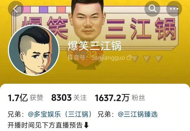 资料显示:多宝娱乐(三江锅),本名阮飞刚,1987年出生于湖北潜江三江村,是抖音平台的头部搞笑创作者。他早年辍学打工,2015年转型短视频创作,凭借地道的湖北方言、乡村题材短剧及标志性蓝色秋衣迅速走红,2019年单月涨粉375万,全网粉丝一度突破2000万。